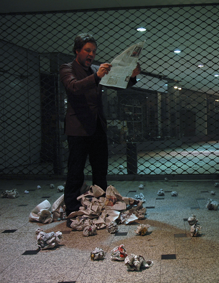 Schmitt sang brutal, apocalyptic and fictitious newspaper articles he had written himself from a daily newspaper. He then burned his alternative facts and opened a "fake news" fire.